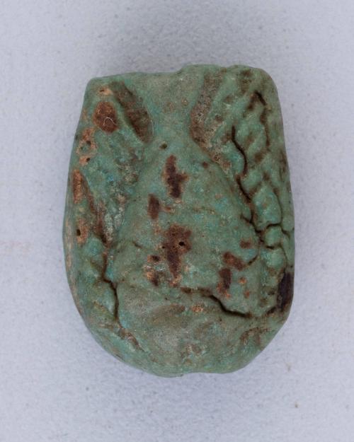 DescriptionUpper surface moulded in relief representing a fish. Green glaze. Pierced lengthwise for threading.