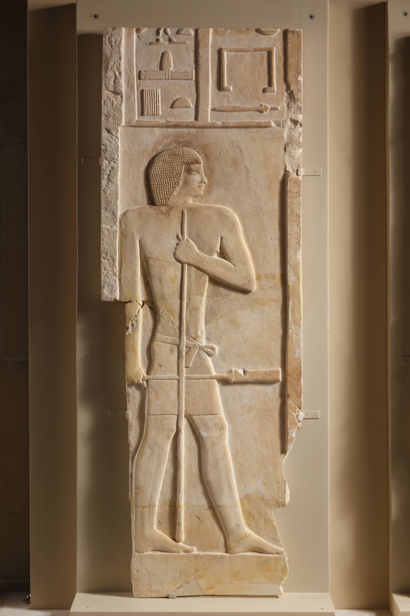 DescriptionThis limestone relief shows the royal official Akhethotep carved in high relief, standing and facing right. He holds a staff in his right hand and a sekhem-scepter—an emblem of authority—in his left. Akhethotep wears a curled wig and a simple wrapped kilt, standard attire for elite men of the Old Kingdom. The two columns of hieroglyphs above him list his titles, which included “overseer of the harem” of Pharaoh Sneferu, as well as prophet of the deities Bubastis and Khnum.