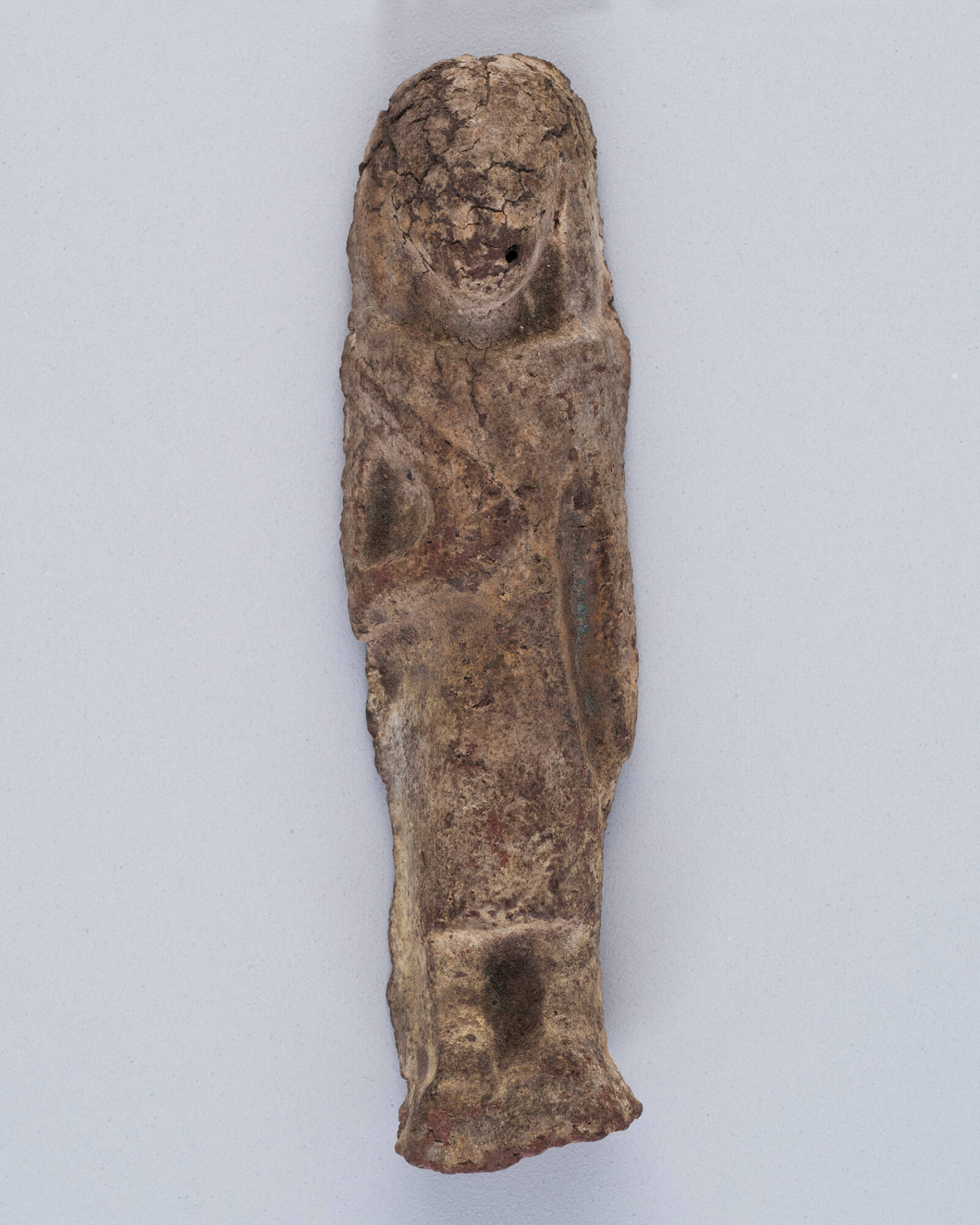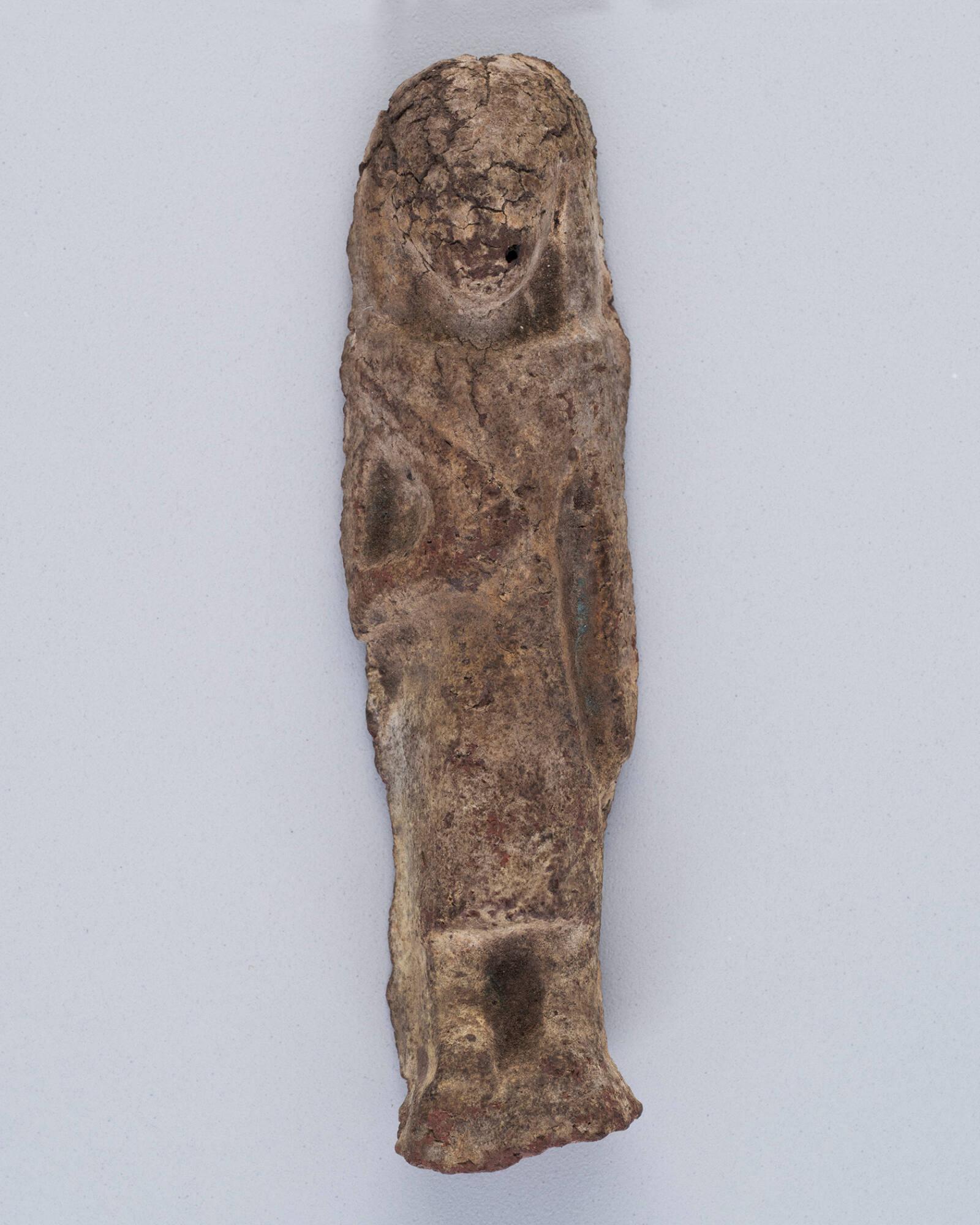 Label TextThis small figurine, known as a shabti, was designed to serve the deceased in the afterlife. While most shabtis were intended to perform manual labor like farming, this specific figure represents an "overseer." Dressed in a triangular apron and holding a whip, its role was to supervise the other shabti workers.Unidentified