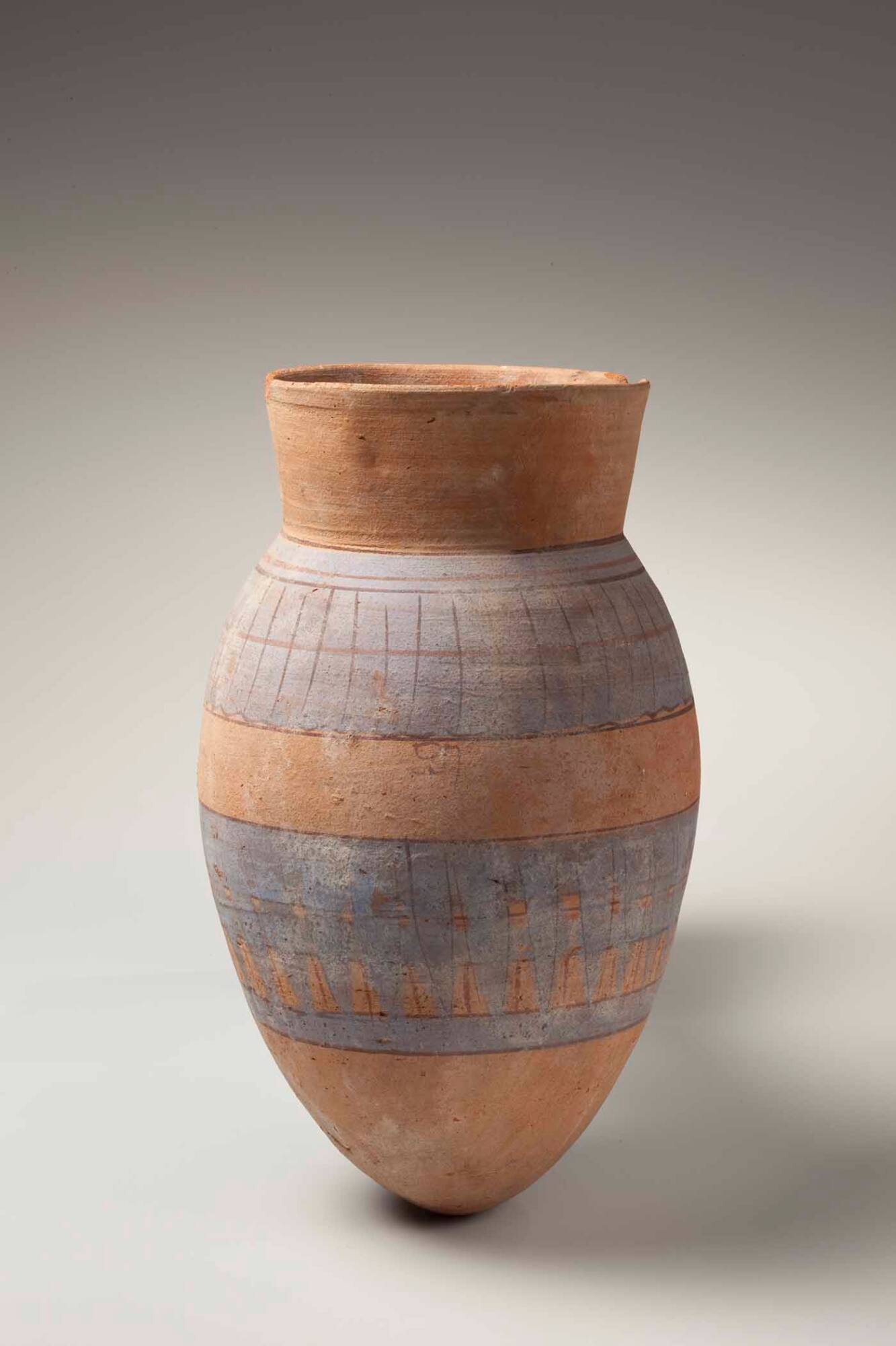 Label TextThis large storage jar is an excellent example of “blue-painted pottery,” a short-lived ceramic tradition of the later Eighteenth Dynasty. The blue lotus, an emblem of rebirth, ppears often on these vessels, its petals curling around jar shoulders like those seen here. Similar jars are shown in tomb paintings, sometimes draped with garlands and set out during feasts or rituals. Excavated at Tell el-Amarna in the 1923–1924 season, this jar was allocated to the Toledo Museum of Art by the Egypt Exploration Society. It is securely identified by its excavation number and matches other published examples from the site. Although its pointed base would have required a stand or embedding in earth, the vessel was clearly more than functional. Its elegant form and symbolic decoration reflect the distinct aesthetics of Akhenaten’s court and the refined artistry of Amarna’s ceramic workshops.Published ReferencesLuckner, Kurt T. "The Art of Egypt, Part 2." Toledo Museum News, New Series: Vol. 14, No. 3, Fall 1971; repr. Fig. 5, p. 64.