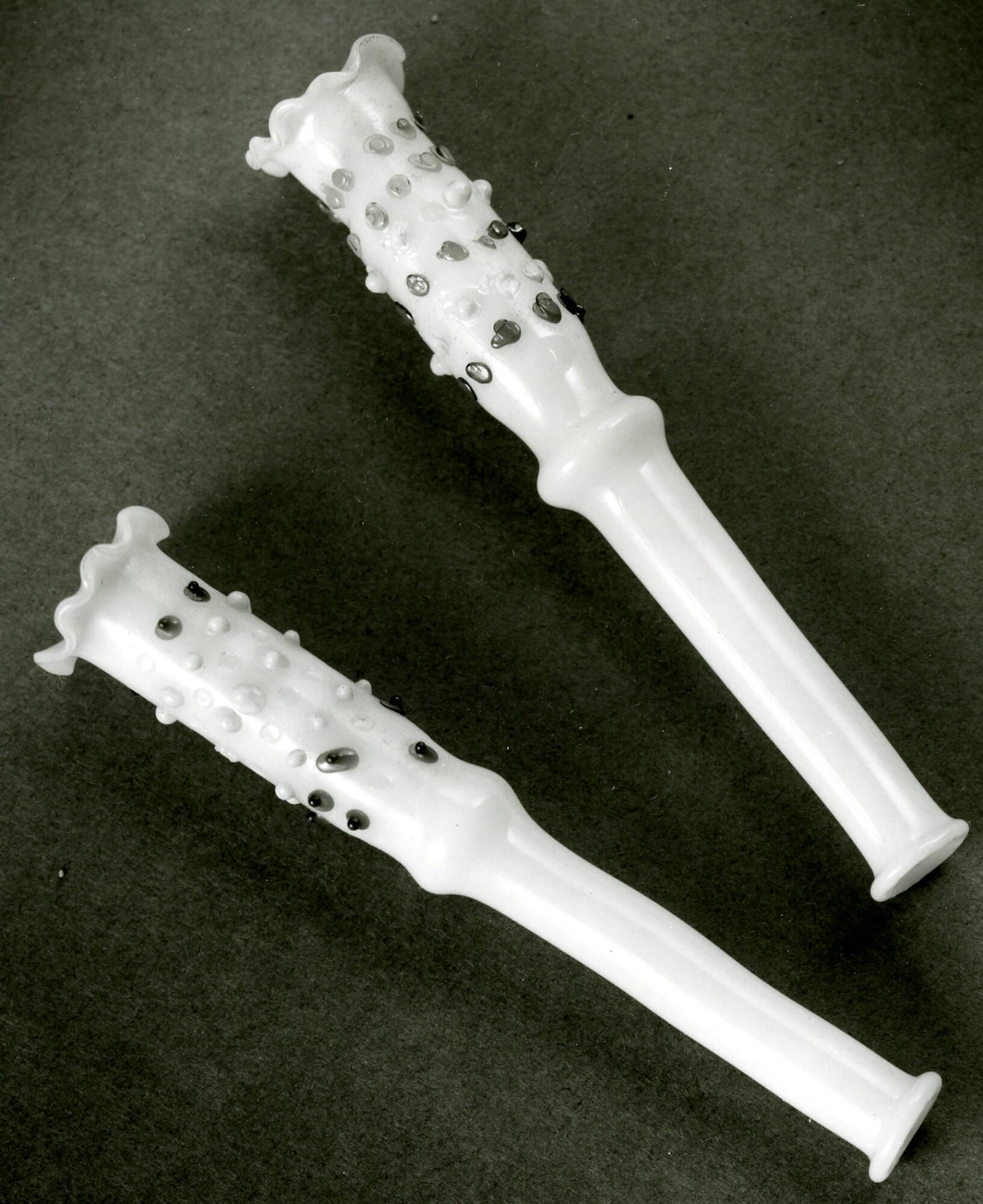 DescriptionBlown, probably from glass tubing, and finished by tooling at the lamp. Lower part of each holder decorated with two rows each of red, yellow, and light blue glass dots.