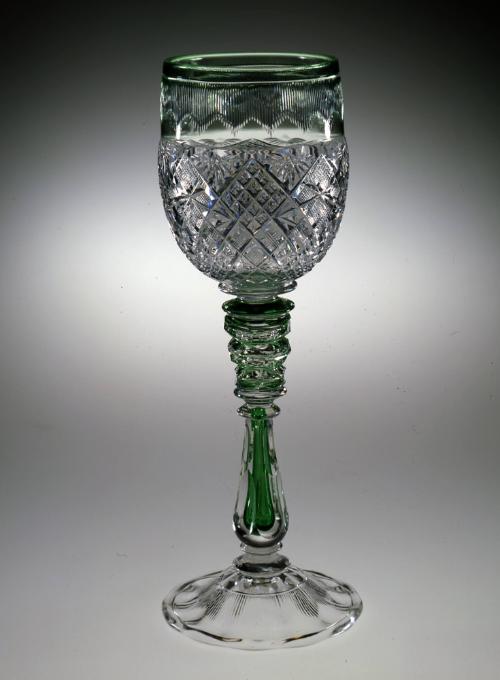 DescriptionCut glass in geometric pattern on bowl - green rim and stem.
