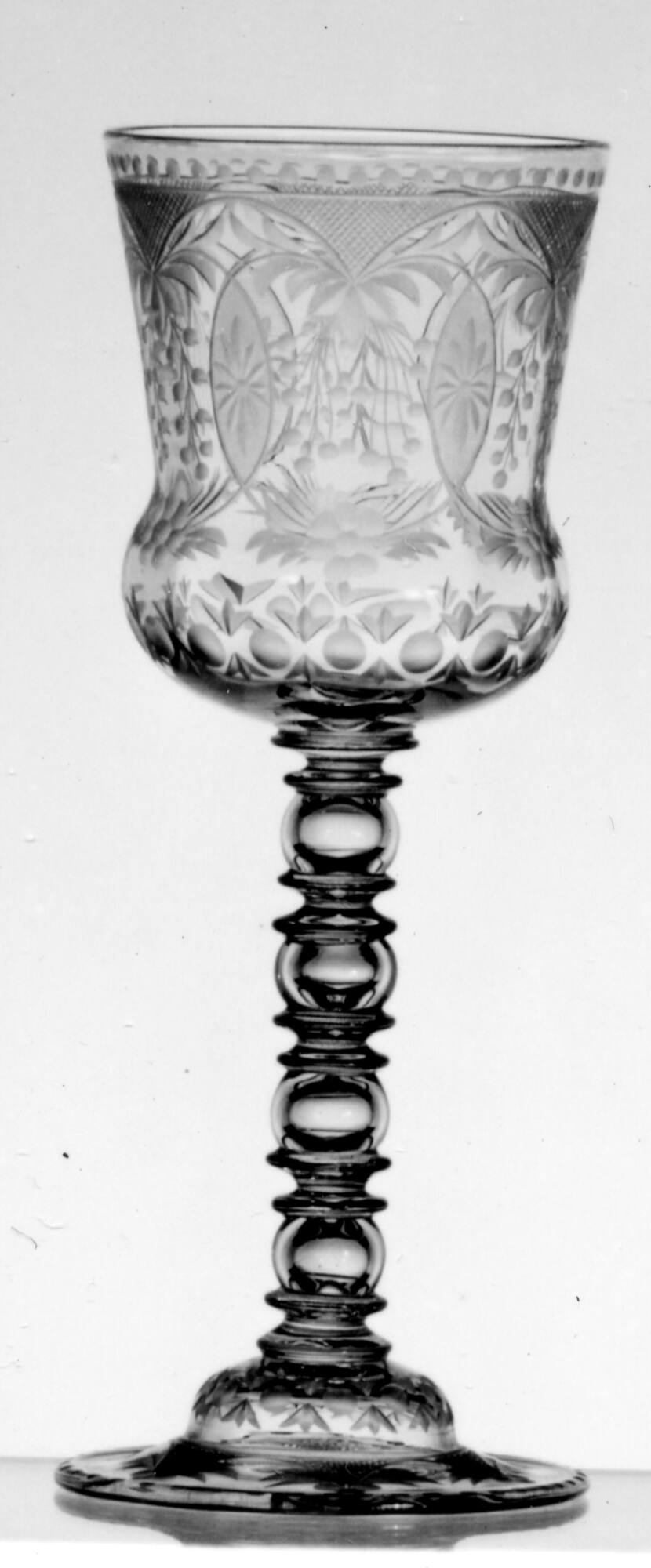 DescriptionElaborately engraved bowl and foot. Stem of light blue glass.