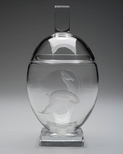 DescriptionLibbey 9708 Candy Jar, engraving Z-2264. Colorless glass, bowl blown in a paste mold, applied to a cast or pressed base; cracked off and rim ground and polished; bottom, sides and edges of base cut and polished. Cover blown, probably in a paste mold, applied to a cast or pressed finial, rim ground and polished; finial cut and polished. Bowl stone wheel engraved with a leaping faun.