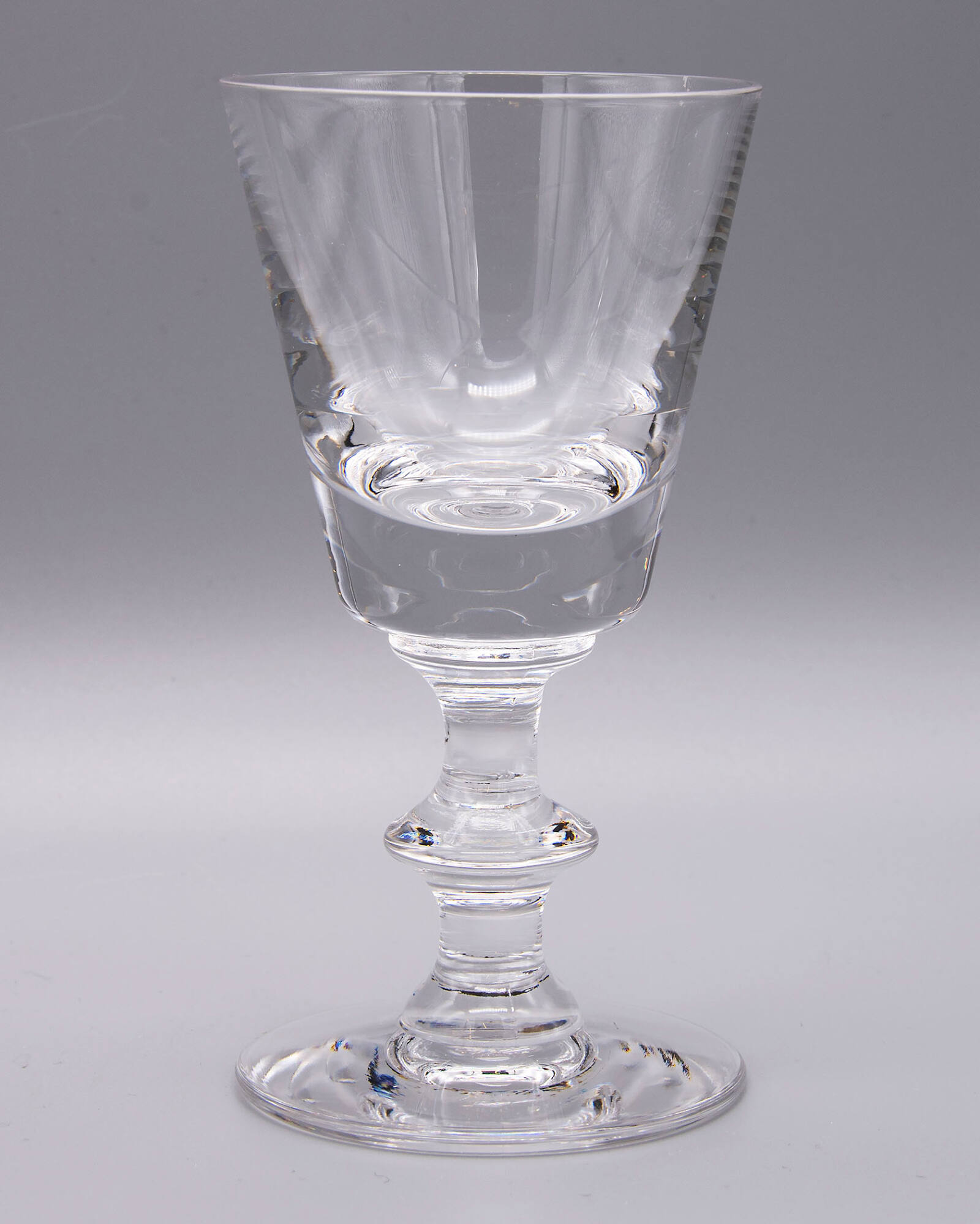 DescriptionWaterford - 7900 Line, no. 7984. Colorless glass, bowl blown in a paste mold, attached directly to a knopped stem pressed in a mold of two vertical sections, attached to an applied, tooled foot; cracked off and rim gound and polished; no pontil mark, slight tooled mark.
