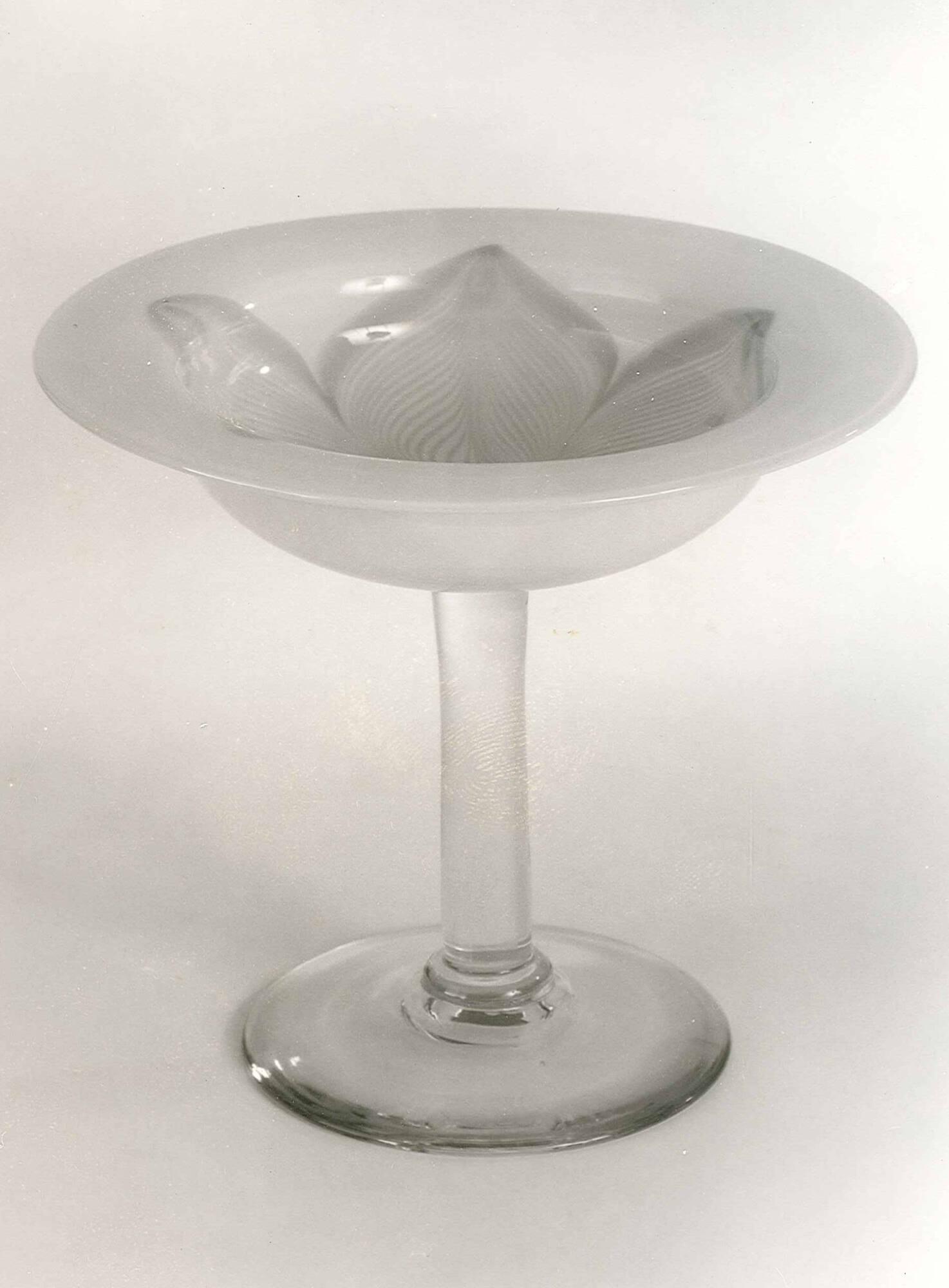 DescriptionBowl made by taking a gather of colorless glass on blowpipe, or pontil rod, encircling it with thread of yellow glass, alternately dragging threads up and down at six points to create petals on gather, rewarming and marvering threads in, then making a gather of opalescent white glass over it and expanding the whole, to which a gather of colorless glass was applied and tooled to form stem; additional gather applied and tooled to form foot. Stuck up at foot, blowpipe cracked off, upper part rewarmed and tooled to form bowl. Pontil mark ground and polished.