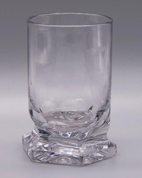 DescriptionColorless glass, blown in a paste mold to form body and foot, tooled, rim sheared and fire polished; large concave polished pontil mark surrounded by polished edge. Bottom edges, sides and upper surface of foot and lower section of body cut and polished.