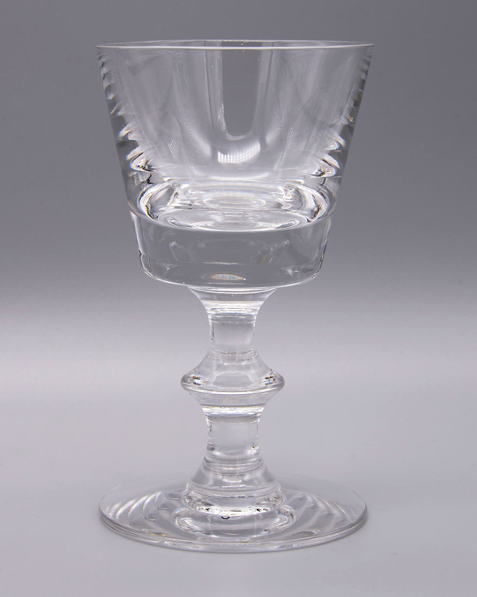DescriptionBelfast, K31-1046, colorless glass, bowl blown, probably in a paste mold; drawn, tooled stem; applied tooled foot. Polished pontil mark. Bowl cut and polished with geometric patterns.
