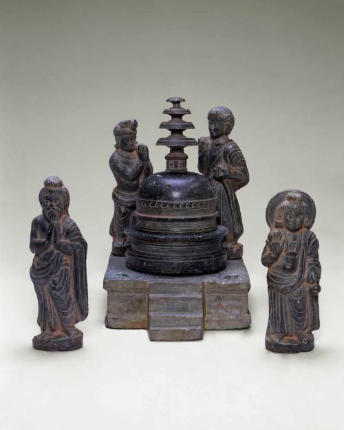 Label TextThe prime object of veneration for Buddhists is a stupa, or funerary shrine, which refers to the original mounds where Buddha’s earthly remains were buried. Full of cosmic symbolism, the stupa (meaning “crown of the head” or “summit”) symbolizes the mind of the Buddha. The various parts of the stupa correspond to the five elements of manifested existence: space/void, wind/air, fire, water, and earth. The domed shape also refers to the dome of the heavens. The spire rising from the middle represents the axis of the world. This rare model of a stupa is encircled by a donor and three holy figures (deities Brahma and Indra, who were adopted from Hinduism, and Maitreya, the Buddha of the Future). It is believed to be a traveling shrine because the pieces can easily be assembled and taken apart again.Published ReferencesJ. Sherrier, "An Important Relic Stupa with Four Freestanding Figures," South Asian Archaeology, 1984, pp.254-256.3rd century