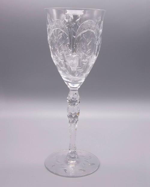 DescriptionK-025-112 (in form), colorless glass, bowl blown in a paste mold, applied stem, probably pressed, then cut; applied tooled foot; no pontil mark; bowl cracked off, rim ground and polished. Bowl intaglio engraved with floral and geometric motifs, polished; underside of foot engraved with circles of stylized leaves, polished. Stem facet cut.