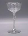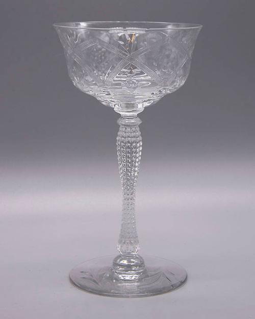 DescriptionColorless glass, bowl optic molded with sixteen vertical ribs, attached directly to a stem pressed in a mold of three vertical sections, applied to a flat circular tooled foot. no pontil mark; cracked off and rim ground and polished. Bowl engraved with six arches enclosing three alternating flowers and florets; underside of foot engraved with two stylized leaf sprays. All engraving polished.