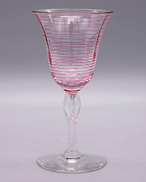 DescriptionTalisman, K-52, threaded. Colorless glass bowl, blown, optic molded with twelve vertical ribs, applied imbedded spiral of ruby glass, applied tooled stem and foot. Bowl probably cracked off and rim fire polished. No pontil mark.