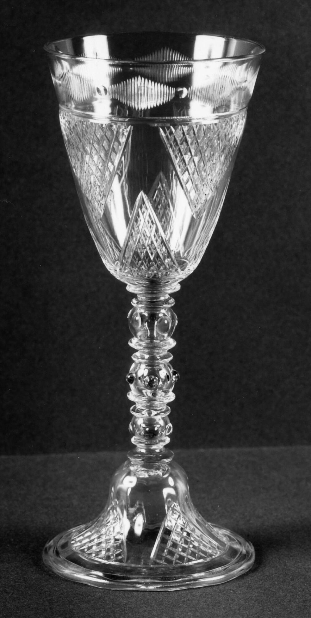 DescriptionCut glass bowl with aqua blue rim. Stem hollow baluster, decorated with blue dots.