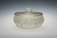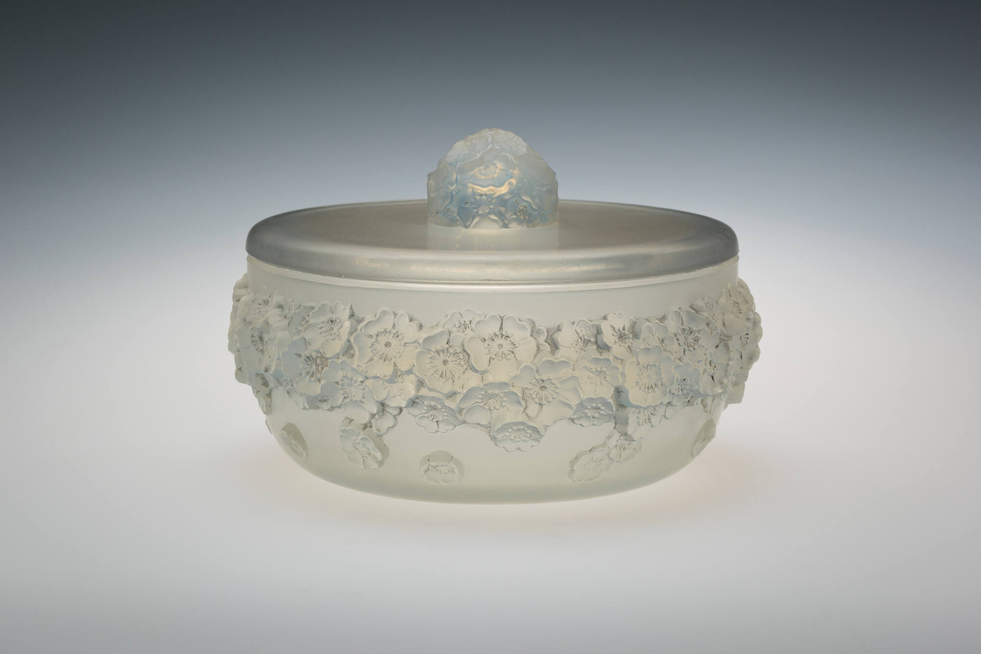 DescriptionThe circular, drum-shaped body is decorated with a wide band of buttercup-like blossoms in relief. The flat lid has a central hemispherical finial that is densely embellished with similar blossoms.