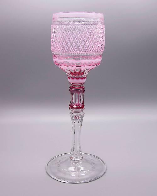 DescriptionBuckingham pattern. Ruby opal overlay, ruby button on stem. Diamond cut on bowl, stem fluted.