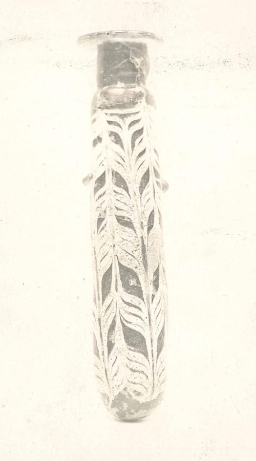 DescriptionThis unguent bottle is core-formed (alabastron); applied rim-disk and lugs; applied marvered threads. Cobalt-blue ground with opaque yellow and opaque turquoise-blue decoration. Moderately broad horizontal rim-disk, uneven and sloping slightly to the outside on one side; wide, rather tall cylindrical neck with slight bulge at its middle; short, pronounced right-angled shoulder with a tooled constriction on the neck; straight-sided cylindrical body with slight upward taper; convex bottom. On the upper body, two small cobalt-blue lugs, each with a depression on its upper surface. An opaque turquoise-blue thread and an opaque yellow thread, both marvered, begun at the shoulder and wound spirally in a wavy line, then tooled in alternating bands into a widely spaced feather pattern extending to the basal angle. Almost complete, with slight iridescence and pitting.