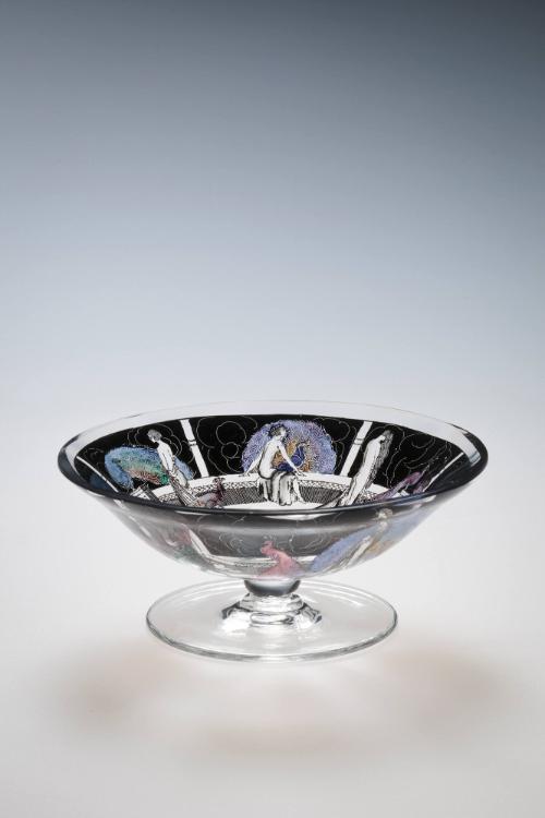 DescriptionThe colorless footed glass bowl was partially stenciled with black enamel and painted with nude female figures and peacocks in a garden setting with additional plinths, steps, and fence work, the whole on a black ring border.