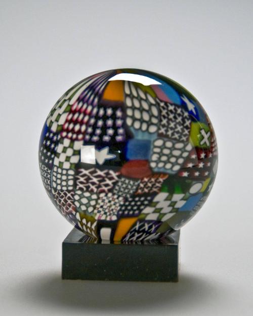 MediumFlameworked, fused murrine canes, hot-worked, assembled, tooled; encased in colorless glass.