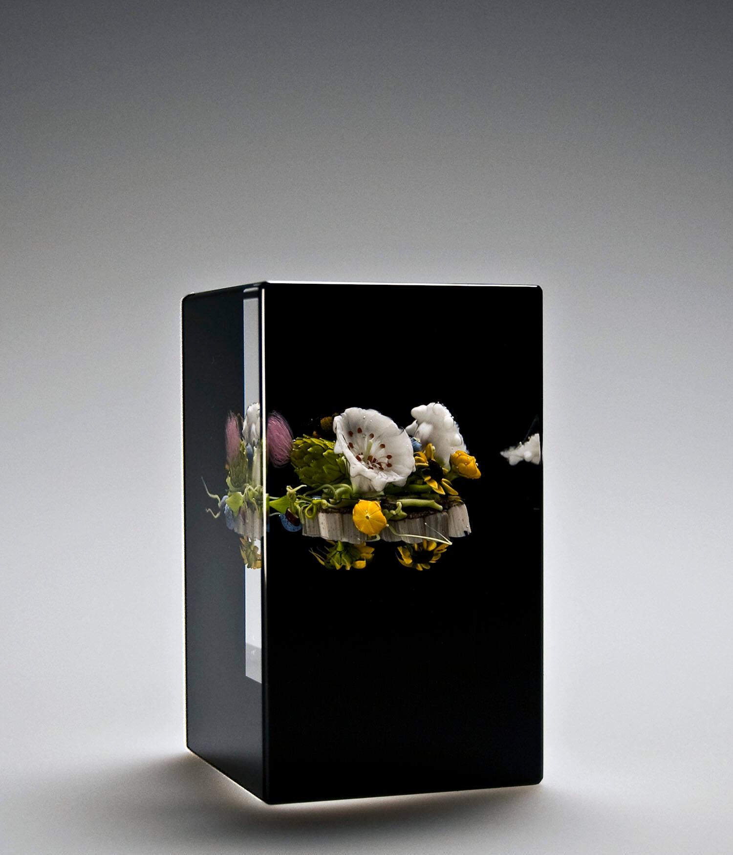DescriptionShort truncated obelisk (with slightly curved top and sides) of solid colorless glass encasing a suspended flower bouquet consisting of green foliage with Canadian thistle, mountain laurels, blueberries and brown-eyed Susans entwined in a honeycomb, a honeybee hovering above. Back side and base of cube are laminated with black plate glass; base ground and polished flat with wide circular ground and polished pontil; four small rubber feet at corners.