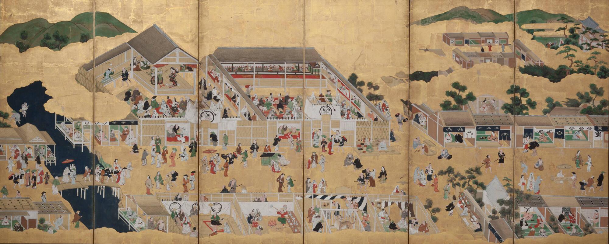 One of a pair of six-fold screens with "Scenes Around the Kamo River, Kyoto"