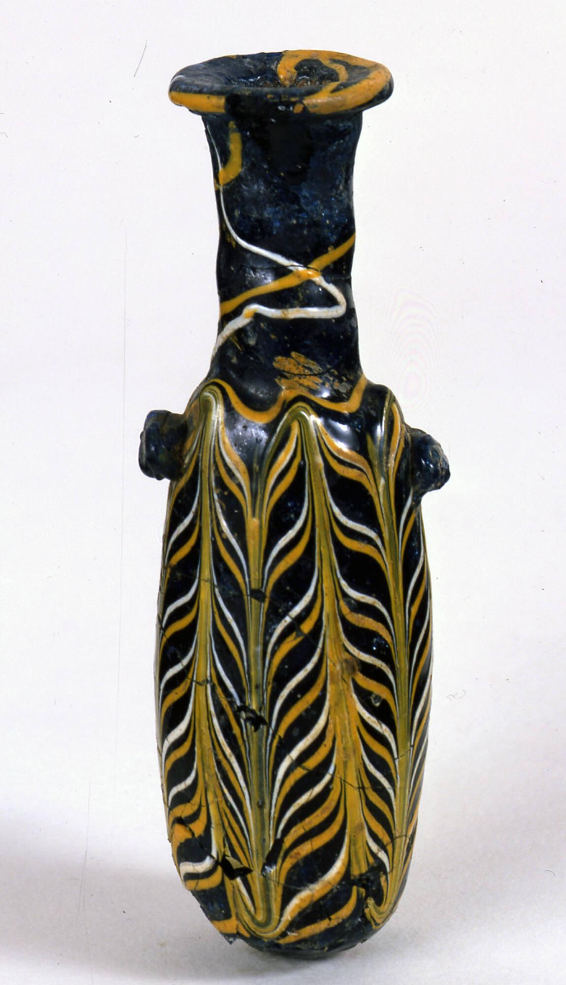 DescriptionThis core-formed unguent bottle, or alabastron, features a dark blue ground decorated with opaque yellow (appearing orangish or even greenish) and opaque white threads. The rim is a narrow, uneven horizontal disk sloping slightly inward with a rounded edge. The tall cylindrical neck tapers downward slightly and is marked by tooling on the neck and shoulder. A rounded shoulder meets the neck at an almost right angle, giving way to a long, oval body with convex sides that taper inward at the base. The bottom is convex.