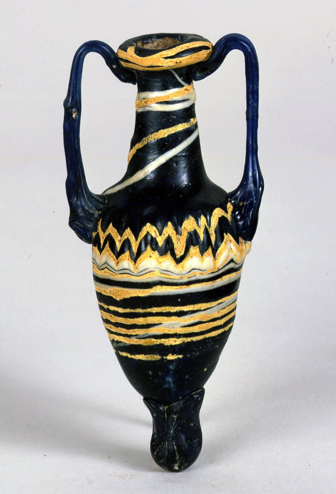 DescriptionThis amphoriskos features a cobalt-blue ground decorated with opaque yellow and opaque white decoration. It has a narrow horizontal rim-disk that slopes slightly outward, a tall cylindrical neck that tapers upward, and an obtuse-angled shoulder. The elongated ovoid body ends in a convex pointed bottom with a cobalt-blue twisted base-knob that has a rounded end. Two vertical cobalt-blue strap handles extend from the shoulder to just above the rim-disk.