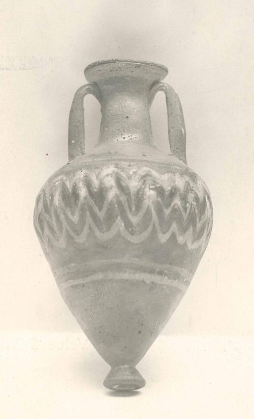 Vertical indentations on the body were caused by the tooling of the zigzags. The vessel was core-formed, and the rim-disk, handles, base-knob, and decorative threads were applied.
