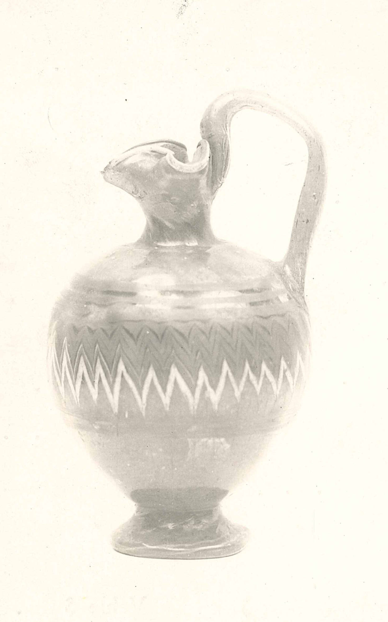 DescriptionThis oinochoe is made of light blue ground with opaque yellow and opaque turquoise-blue decoration. It features a broad trefoil rim-disk and a short cylindrical neck, with the lip of the vessel visible within. The shoulder meets the neck at an almost right angle and transitions into a broad ovoid body with a convex bottom. The vessel rests on a short outsplayed light blue foot, concave on its underside.