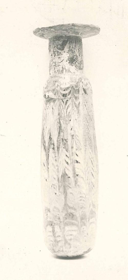 DescriptionThis unguent bottle, or alabastron, is made of core-formed glass with a blue ground and decoration in opaque yellow and possibly opaque white (now obscured by weathering). It features a broad, slightly inward-sloping rim-disk, a tall cylindrical neck that tapers upward, and a cylindrical body with nearly straight sides that swell slightly at the middle. The shoulder is distinct and rounded, and the base is shallow and convex.