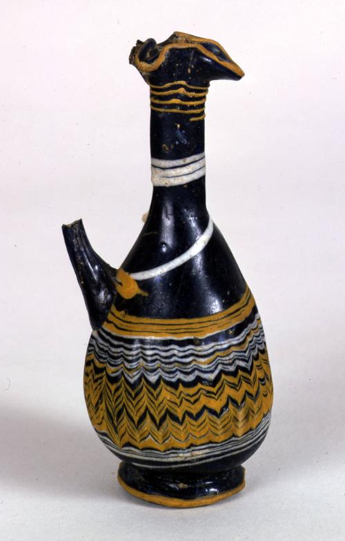 DescriptionThis small unguent bottle (oinochoe) has a cobalt-blue ground with decoration in opaque white and opaque yellow (appearing orangish). It features a broad trefoil rim-disk, a tall cylindrical neck, an obtuse-angled shoulder, and a fairly straight-sided piriform body. The vessel is completed by a circular cobalt-blue pad-base that is nearly flat underneath with a rounded edge. Only vestiges remain of a cobalt-blue strap handle, which once extended from below the shoulder to just beneath the rim-disk and likely arched above it.