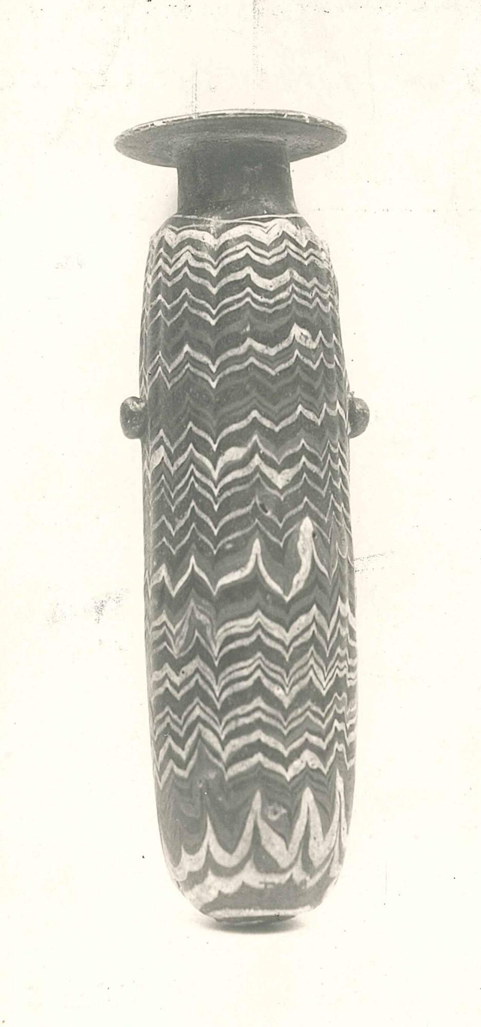 An opaque white thread, marvered, begins on the shoulder and is wound in a horizontal line before being tooled into a loosely executed zigzag pattern that extends to the basal angle. There, the thread resumes in a horizontal line around the bottom. A marvered opaque yellow thread begins below the shoulder and intertwines with the white thread down to the base. The vessel is core-formed, with applied lugs and marvered and unmarvered thread decoration. Long vertical indentations on the body result from the tooling of the zigzag pattern.