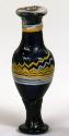 DescriptionThis core-formed unguentarium has a cobalt-blue ground decorated with opaque yellow (appearing orangish) and opaque white threads. The vessel features a thick, moderately broad horizontal rim-disk with a rounded edge, a tall cylindrical neck, and an obtuse-angled shoulder leading into a tapering ovoid body that ends in a pointed bottom. The outsplayed foot is tall, also cobalt blue, and has a deep cavity on its underside. An opaque yellow thread, partly marvered, and a marvered opaque white thread begin near the top of the neck and are wound spirally in horizontal lines. These continue diagonally across the shoulder and onto the body, where they are tooled into a shallow horizontal zigzag pattern and then return to nearly horizontal lines around the midsection.