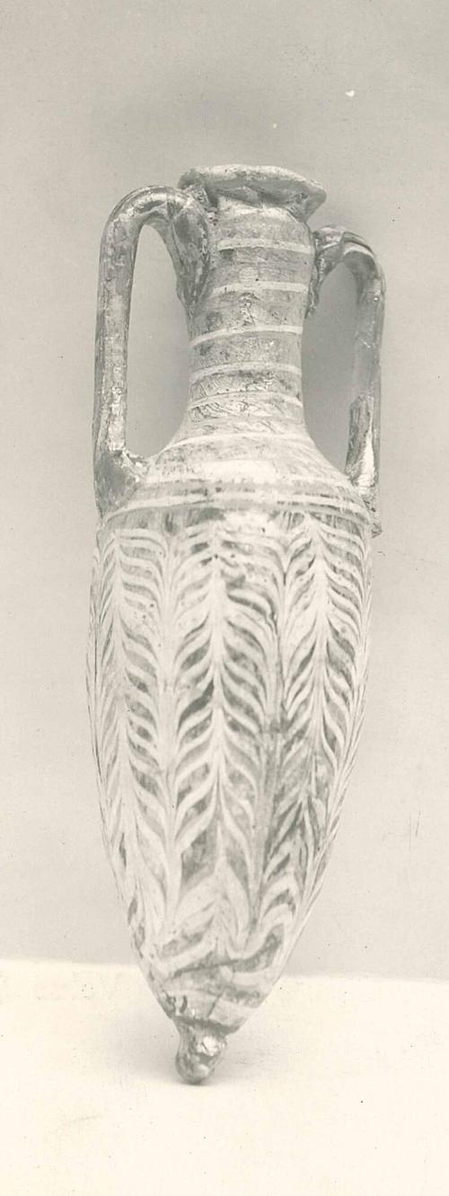 DescriptionThis core-formed amphoriskos features a blue ground streaked with opaque red, decorated with marvered opaque white and yellow threads. It has a narrow, uneven, inward-sloping horizontal rim-disk, a tall cylindrical neck, and a short, obtuse-angled shoulder. The narrow, elongated ovoid body tapers to an almost pointed bottom, which rests on a small, rounded blue-green base-knob with an uneven end. Two vertical, colorless strap handles rise from the shoulder to just below the rim-disk.
