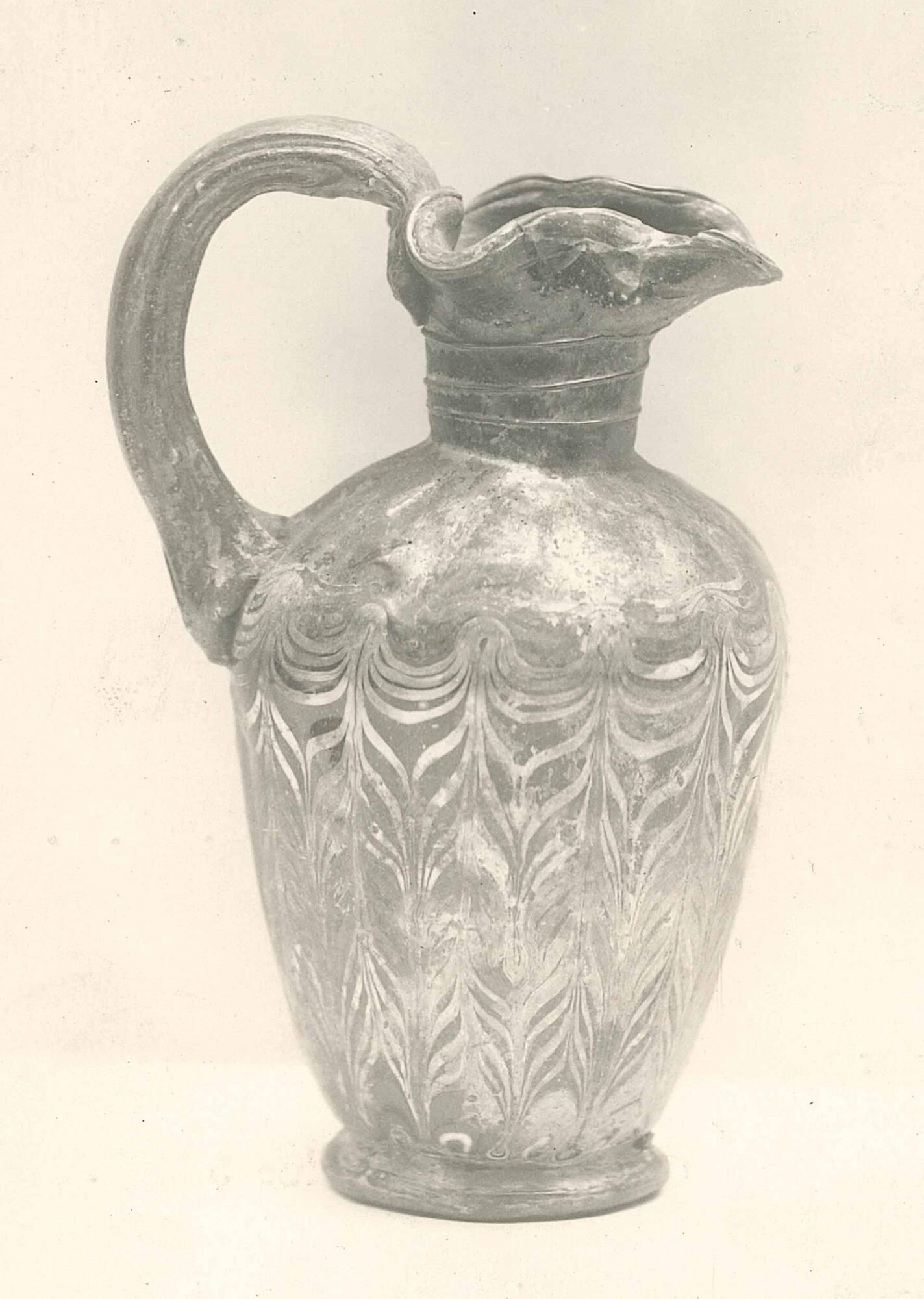An unmarvered opaque yellow thread is applied at the rim, followed by another unmarvered yellow thread wound in nearly horizontal spirals around the upper neck. A third opaque yellow thread, marvered, begins on the shoulder and is tooled first into a wavy line, then into several festoons, and finally into a feather pattern extending toward the base. Alternating with this are bands of marvered opaque white thread, both colors ending in loops. An additional unmarvered opaque yellow thread encircles the edge of the pad-base. The vessel was created by applying marvered and unmarvered threads, in addition to its applied handle, rim-disk, and base.