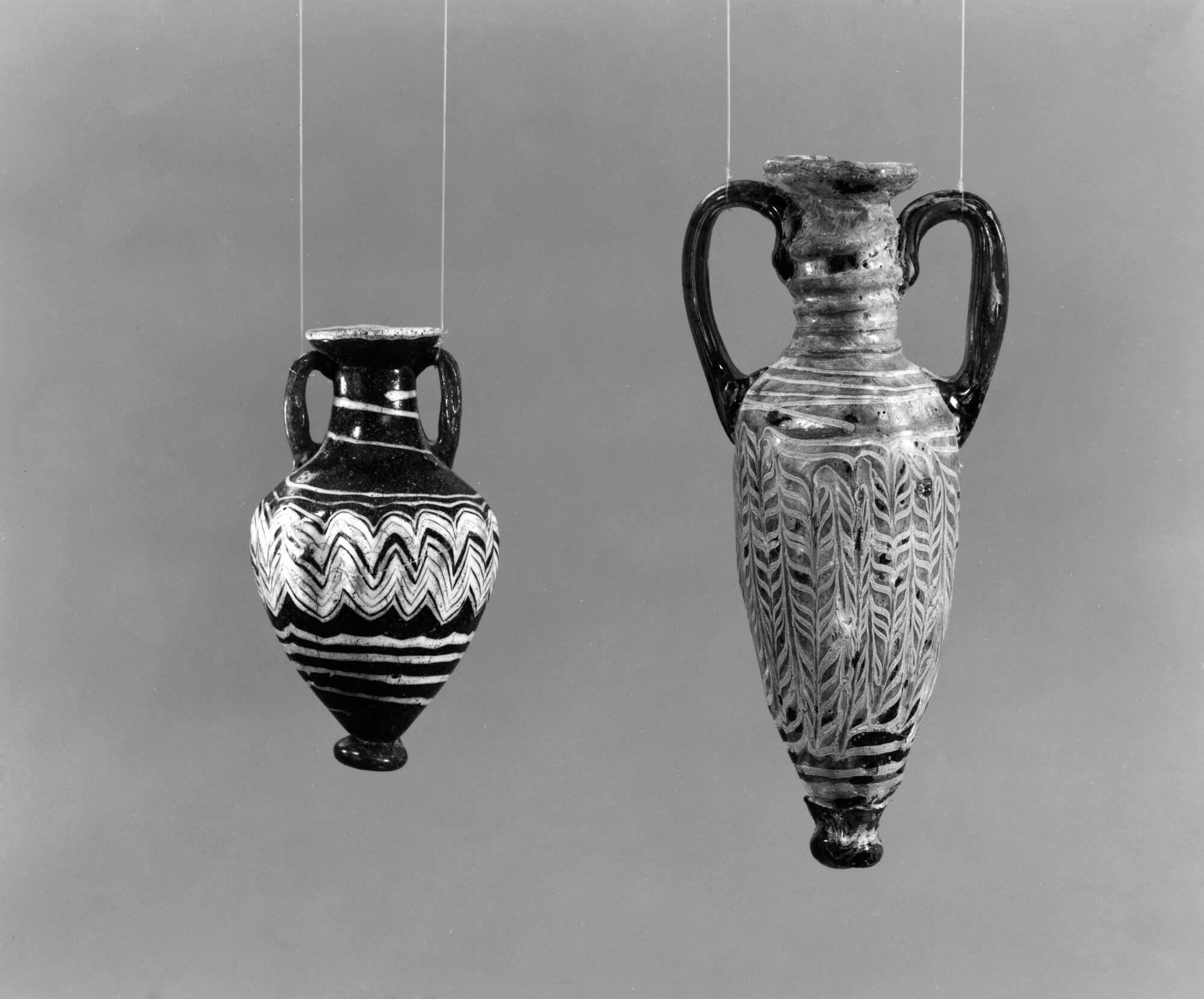 DescriptionThis amphoriskos features a blue ground with opaque white and likely opaque yellow decoration. The vessel has a moderately broad rim-disk that is lopsided and slopes inward, a tall cylindrical neck that bulges outward at the middle, an obtuse-angled shoulder, an elongated ovoid body, and a nearly pointed bottom. Its uneven base-knob is golden-yellow with a flat end. Two vertical strap handles of the same golden-yellow hue extend from the shoulder to the middle of the neck, rising just below the rim-disk.