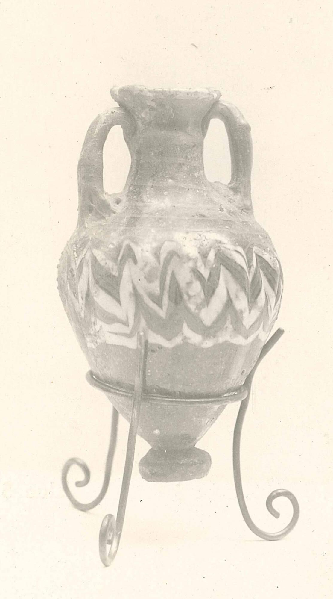 An opaque turquoise-blue thread, unmarvered, is attached at the edge of the rim-disk. A marvered opaque yellow thread begins on the neck and is wound spirally in uneven horizontal lines around the neck and shoulder. Below this, three wide turquoise-blue threads and several narrow yellow threads, all marvered, are tooled into a close-set zigzag pattern around the middle of the body. An irregular opaque yellow thread is wound in horizontal lines around the lower body. Additional yellow streaks are visible on the base-knob. The vessel is core-formed, with applied rim-disk, handles, and base-knob, and applied marvered and unmarvered threads. Vertical indentations caused by the tooling of the zigzag pattern are visible on the body.
