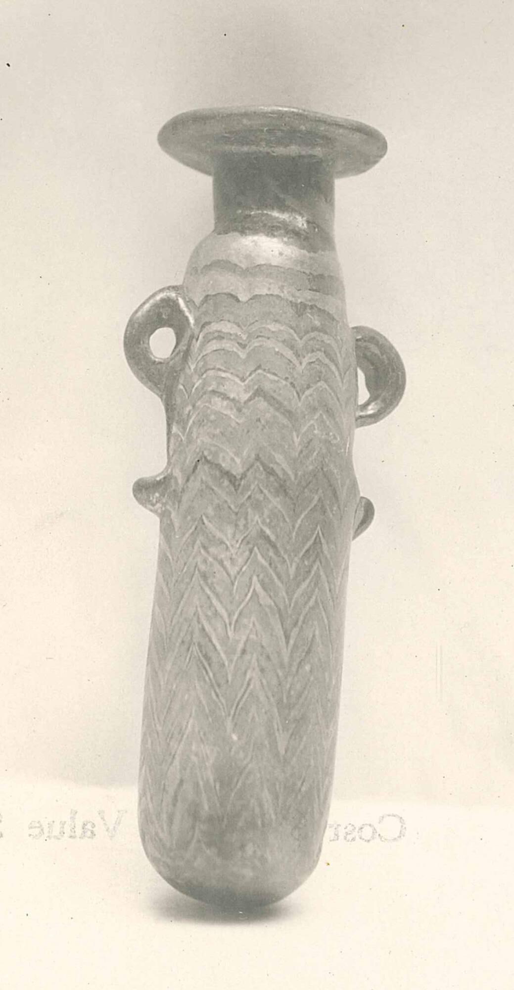 DescriptionAlabastron with an opaque dark brown ground streaked with opaque red, and decorated with opaque yellow and opaque turquoise-blue threads. It has a broad horizontal rim-disk, a rather tall cylindrical neck, an uneven rounded shoulder, and a straight-sided cylindrical body tapering to a convex bottom. Two exceptionally large vertical ring handles with knobbed tails are applied just below the shoulder. An opaque yellow thread, unmarvered, is attached at the edge of the rim-disk. A marvered turquoise-blue thread and a marvered opaque yellow thread begin on the neck, spiraled in a few horizontal lines that largely cover the ground, then tooled into a close-set zigzag pattern extending to the bottom. The vessel is core-formed, with applied rim-disk, handles, and marvered and unmarvered threads.