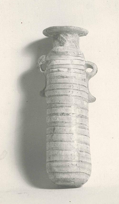 DescriptionThis alabastron is made of opaque dark brown glass streaked with opaque red and decorated with opaque yellow and opaque turquoise-blue threads. It features a broad horizontal rim-disk, a cylindrical neck, a pronounced rounded shoulder, and a straight-sided cylindrical body terminating in an uneven, flat bottom. Below the shoulder are two long vertical ring handles with knobbed tails, made of the same opaque dark brown glass and placed at different heights on the body. An unmarvered opaque yellow thread is attached at the edge of the rim-disk. A second opaque yellow thread and an opaque turquoise-blue thread, both marvered, are applied beginning on the neck and wound spirally in close-set, nearly horizontal lines down to the center of the bottom. The vessel was made using the core-forming technique, with applied rim-disk, handles, and applied marvered and unmarvered threads.