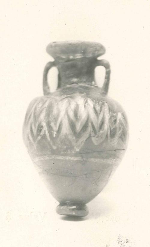 DescriptionThis amphoriskos features a cobalt-blue ground decorated with opaque yellow and opaque turquoise-blue threads. It has a broad, inward-sloping rim-disk, a cylindrical neck, an obtuse-angled shoulder, and a top-shaped body. The circular cobalt-blue base-knob has a rounded edge and is nearly completely covered by a marvered opaque yellow thread. Two cobalt-blue vertical strap handles, largely restored, extend from the shoulder to the upper part of the neck. An unmarvered opaque yellow thread is attached at the edge of the rim-disk. A second opaque yellow thread and an opaque turquoise-blue thread, both marvered, begin on the shoulder and are tooled into a close-set zigzag pattern extending to the middle of the body. Below this, another opaque turquoise-blue thread and a thin opaque yellow thread, both marvered, are wound horizontally around the lower part of the body. Short vertical indentations on the body result from the tooling of the zigzags. The vessel was made using the core-forming technique, with applied rim-disk, handles, base-knob, and applied marvered and unmarvered threads.