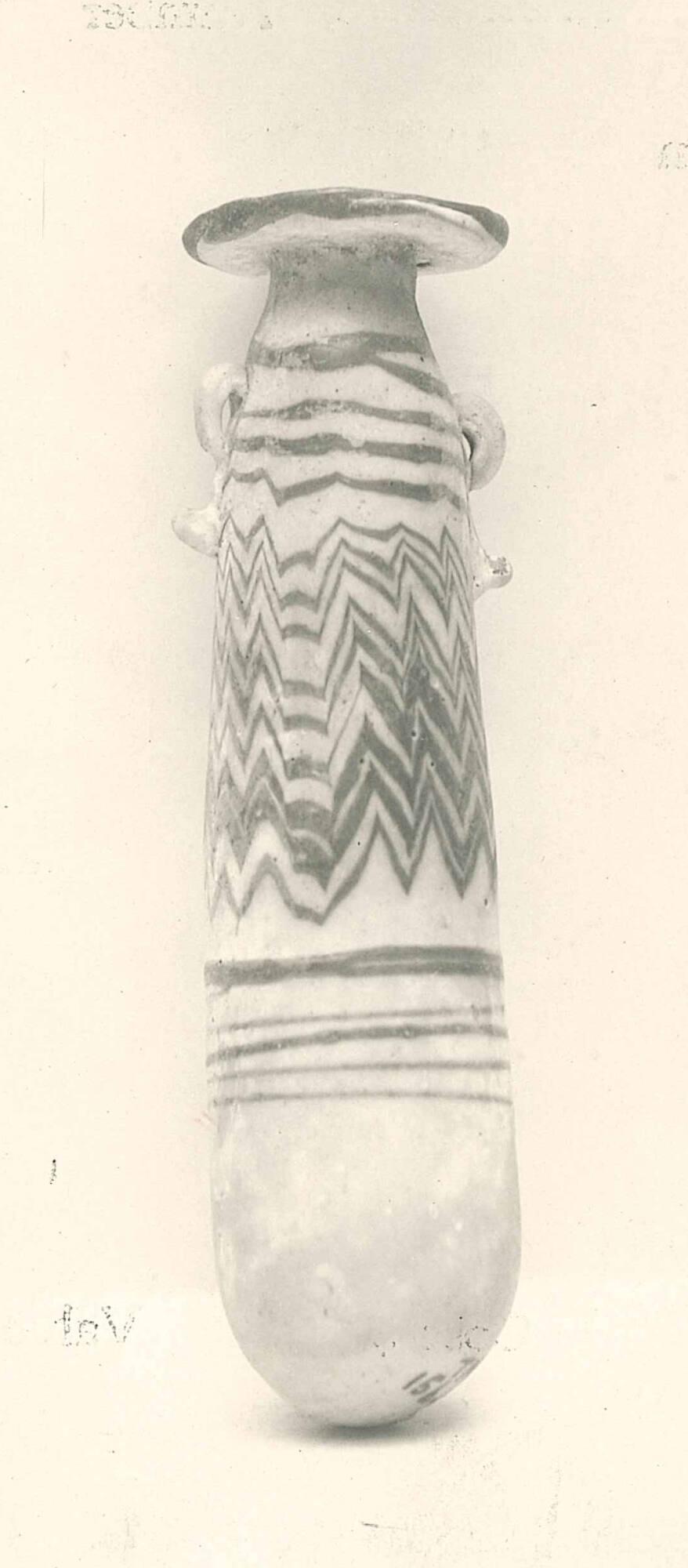 An uneven, unmarvered purple thread is attached at the edge of the rim-disk. A second purple thread, marvered, begins on the neck and is wound spirally at first in nearly horizontal lines, then tooled into an uneven zigzag pattern extending below the middle of the body. Beneath this, a third thread, partly marvered, is wound horizontally six times around the body. At the center of the bottom, there is a rough, partly marvered opaque white dot.