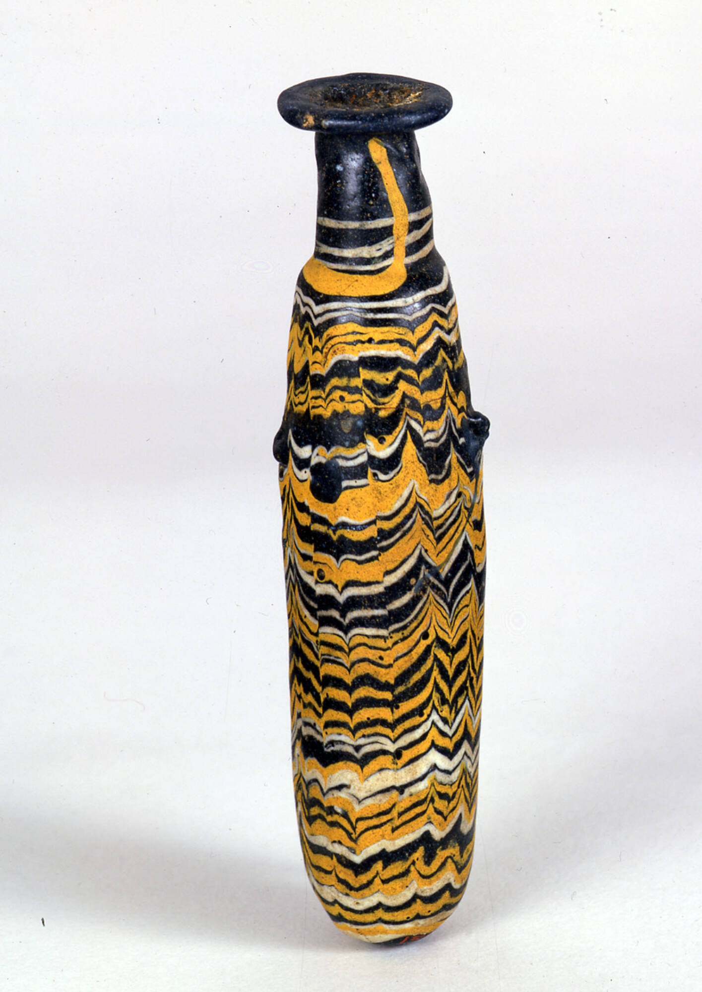 Two small dark blue lugs are positioned above the middle of the body. These are drawn out from the side of the vessel: one is formed with a depression on its upper surface; the other is irregular in shape. A marvered opaque yellow thread is applied vertically at the top of the neck, where it is joined by a marvered opaque white thread. These two threads spiral in alternating bands across the shoulder and upper body, then are tooled into a highly irregular, shallow zigzag pattern extending toward the basal angle. Below this, the yellow thread continues in a loosely undulating line.