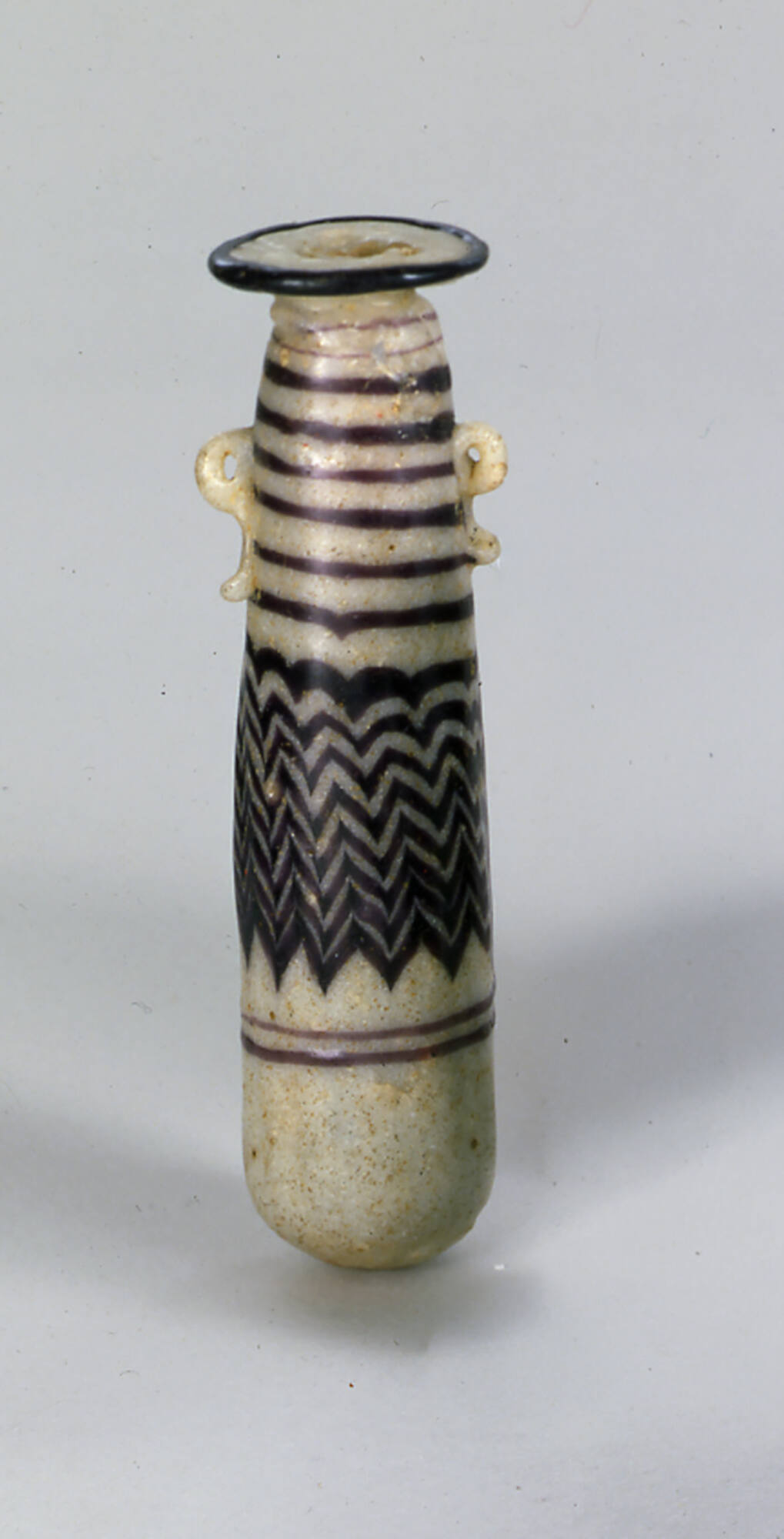 Two vertical ring handles with knobbed tails, made of opaque white glass, are applied below the shoulder and set slightly askew. An unmarvered purple thread is attached at the edge of the rim-disk. A second thread, marvered, begins on the neck and is wound spirally in nearly horizontal lines, then tooled into a zigzag pattern that extends to below the middle of the body. A third thread, partly marvered, is wound horizontally twice around the lower body.
