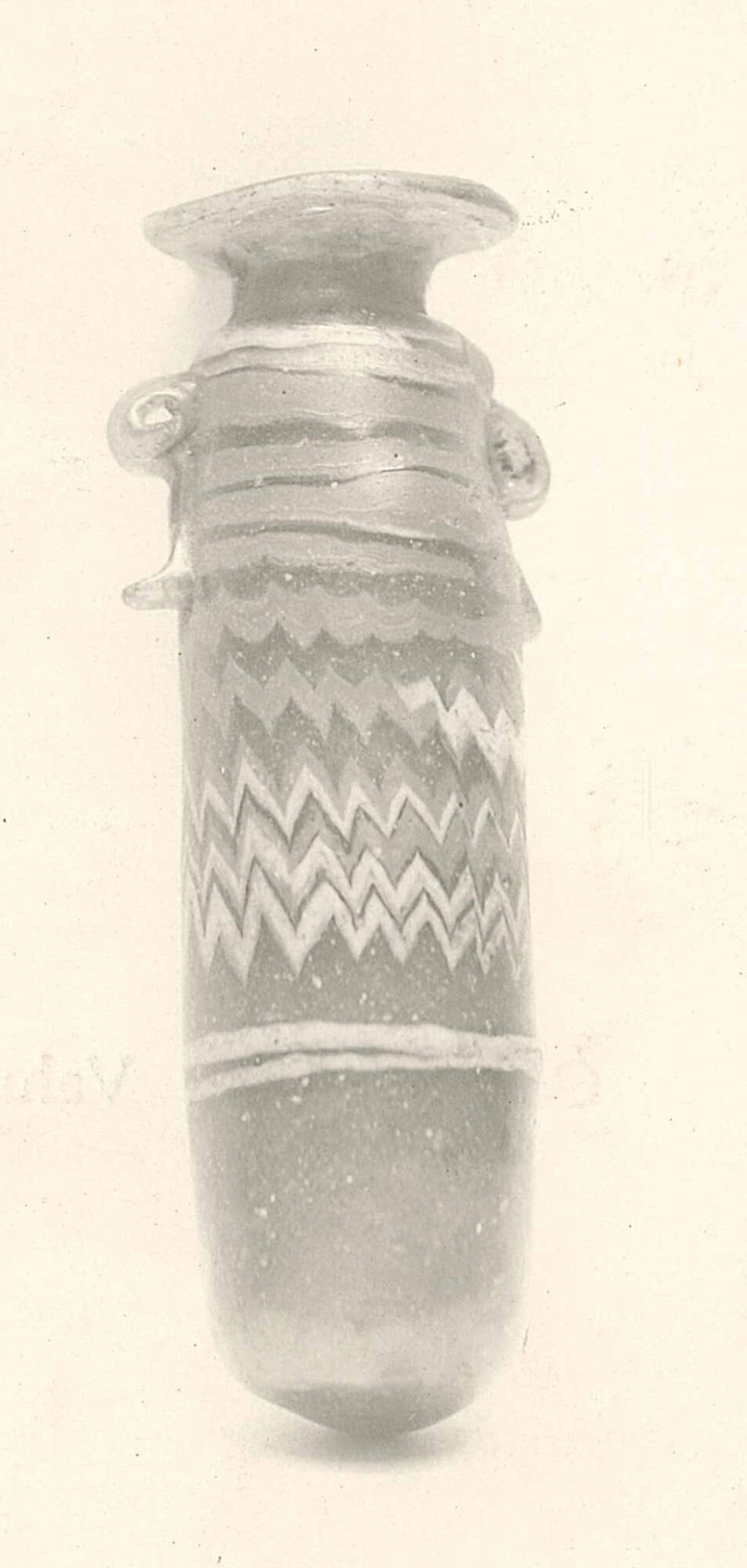 Unmarvered opaque yellow and turquoise-blue threads are attached at the edge of the rim-disk. A marvered turquoise-blue thread begins on the neck and winds once around the shoulder. A marvered opaque yellow thread is then added, spiraling in irregular horizontal lines before being tooled into a zigzag pattern extending to the middle of the body. A third marvered turquoise-blue thread, mingling with the yellow, continues the decoration, followed by a fourth turquoise-blue thread, also marvered, wound twice horizontally around the lower body. The vessel was manufactured using the core-forming technique and includes applied rim-disk, handles, and both marvered and unmarvered threads.
