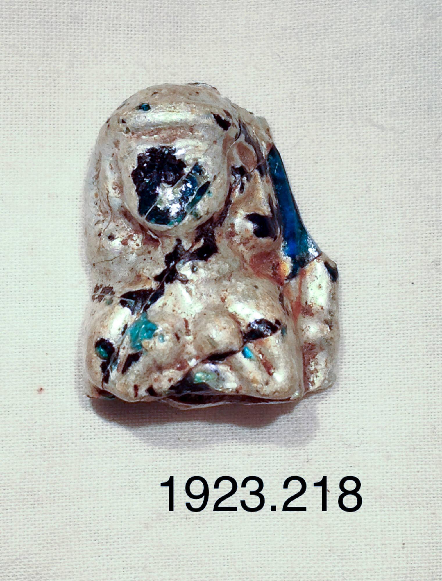 Label TextThis fragmentary glass pendant, dating to around 1500 B.C., preserves the upper portion of a standing female figure, part of a small group of goddess pendants (1923.195, 1923.214, 1923.218) that are among the earliest glass objects in the Museum’s collection. The figure’s gesture of holding her breasts is a widespread symbol of fertility, childbirth, and protection. Pendants like this have been found in Egypt, the Levant, Mesopotamia, Asia Minor, Cyprus, and Mycenaean Greece, especially at Megiddo, Lachish, and Beth Shean, where their temple contexts suggest a votive function. While often linked to Ishtar (Astarte), their widespread use indicates a broader fertility-related significance rather than direct divine representation. Similar figures in metal and pottery highlight a shared religious tradition across the region. This pendant was cast in an open, one-piece mold, with a raised moldmark on the right arm and a thread hole for suspension. Its widespread distribution suggests it was part of an interconnected trade and religious network.Published ReferencesBarag, Dan P., "Mesopotamian Core-Formed Glass Vessels (1500-500 B.C.)," in A. Leo Oppenheim, Robert H. Brill, Dan P. Barag, and Axel von Saldern, Glass and Glassmaking in Ancient Mesopotamia, Corning, N.Y., 1970, pp. 188-189 and 199.