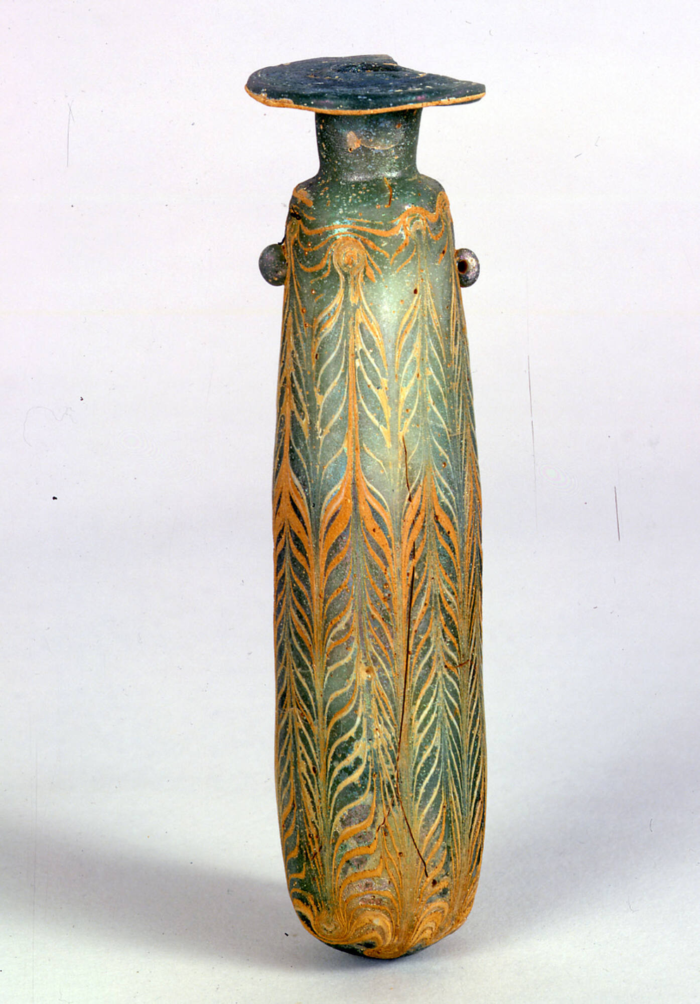 Decoration begins with an unmarvered opaque yellow (possibly white) thread attached at the rim-disk’s edge. Below this, a second opaque yellow and an opaque white thread, both marvered, are wound in near-horizontal, wavy lines around the shoulder. These threads are then tooled into a widely spaced feather pattern, divided into eight vertical panels extending to the base and ending in irregular loops.