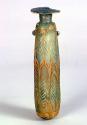DescriptionThis tall core-formed alabastron has a pale green body with a bluish tinge, decorated with opaque white and possibly opaque yellow threads. The broad, horizontal rim-disk has a rounded edge, and the neck tapers downward into a sharply angled shoulder. The cylindrical body has a slight upward taper and ends in a convex base. Two vertical pale green ring handles are attached just below the shoulder; both are unpierced.