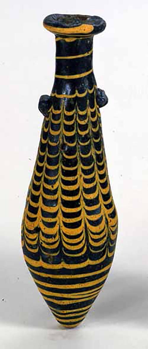 DescriptionThis core-formed alabastron has a dark blue ground (appearing black) decorated with opaque yellow (appearing orangish) marvered threads. The moderately broad rim-disk is lopsided, uneven, and slightly inward-sloping, with the lip extending vertically above the disk. The cylindrical neck tapers slightly upward into a vestigial shoulder. The body is fusiform with straight sides and an almost pointed bottom. Two blue lugs are applied below the shoulder, each with a depression—one angled outward, the other upward.