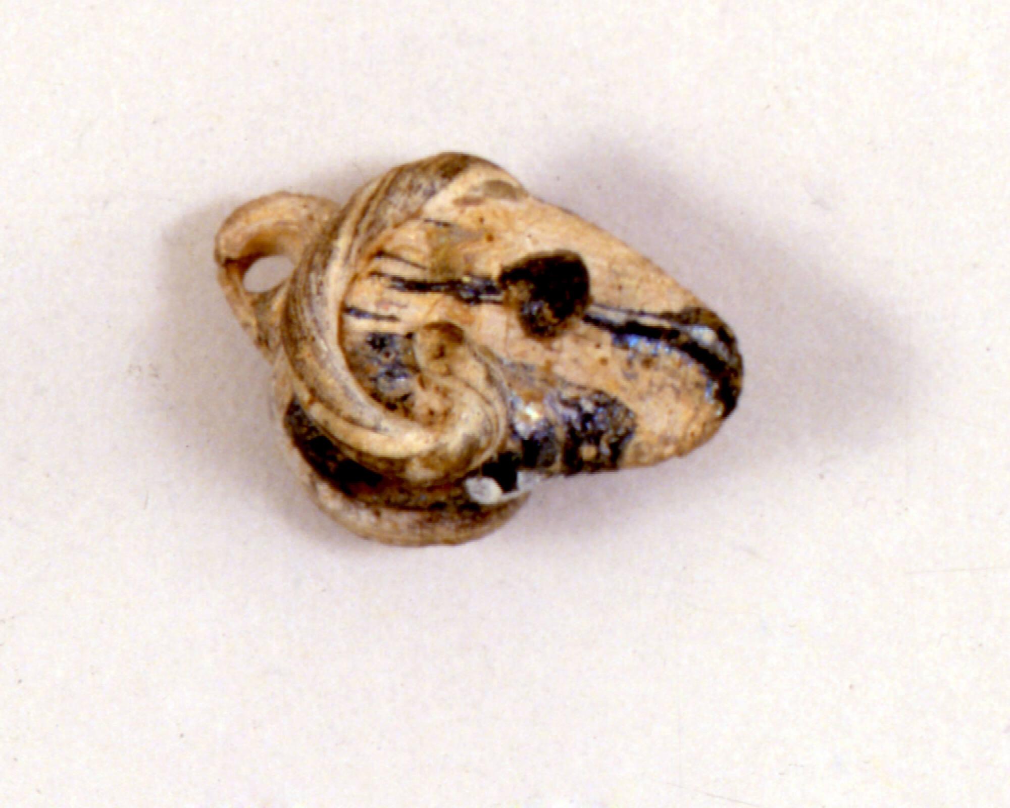 DescriptionSmall pendant in the likeness of a ram's head. The object has a dark-colored ground with a face streaked with opaque white and possibly opaque yellow. The eyes are dark. The small vertical suspension ring is of uncertain color. The curving horns are in a dark ground, streaked with opaque white threads. The pendant has an elongated pyramidal shape..