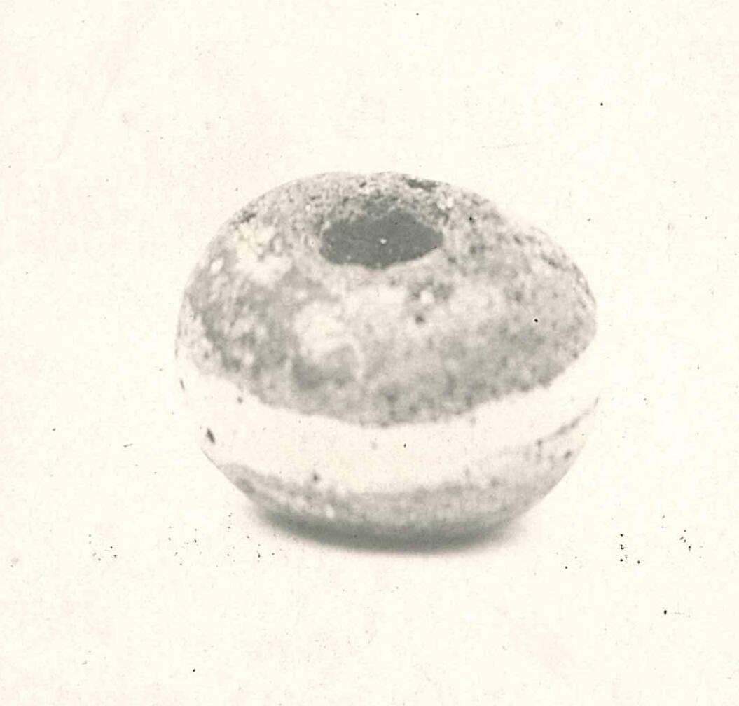DescriptionThis globular bead is formed from opaque black glass and decorated with a single raised line of opaque white glass. The thread was applied plastically and impressed into the surface while still hot, producing a smooth finish overall.