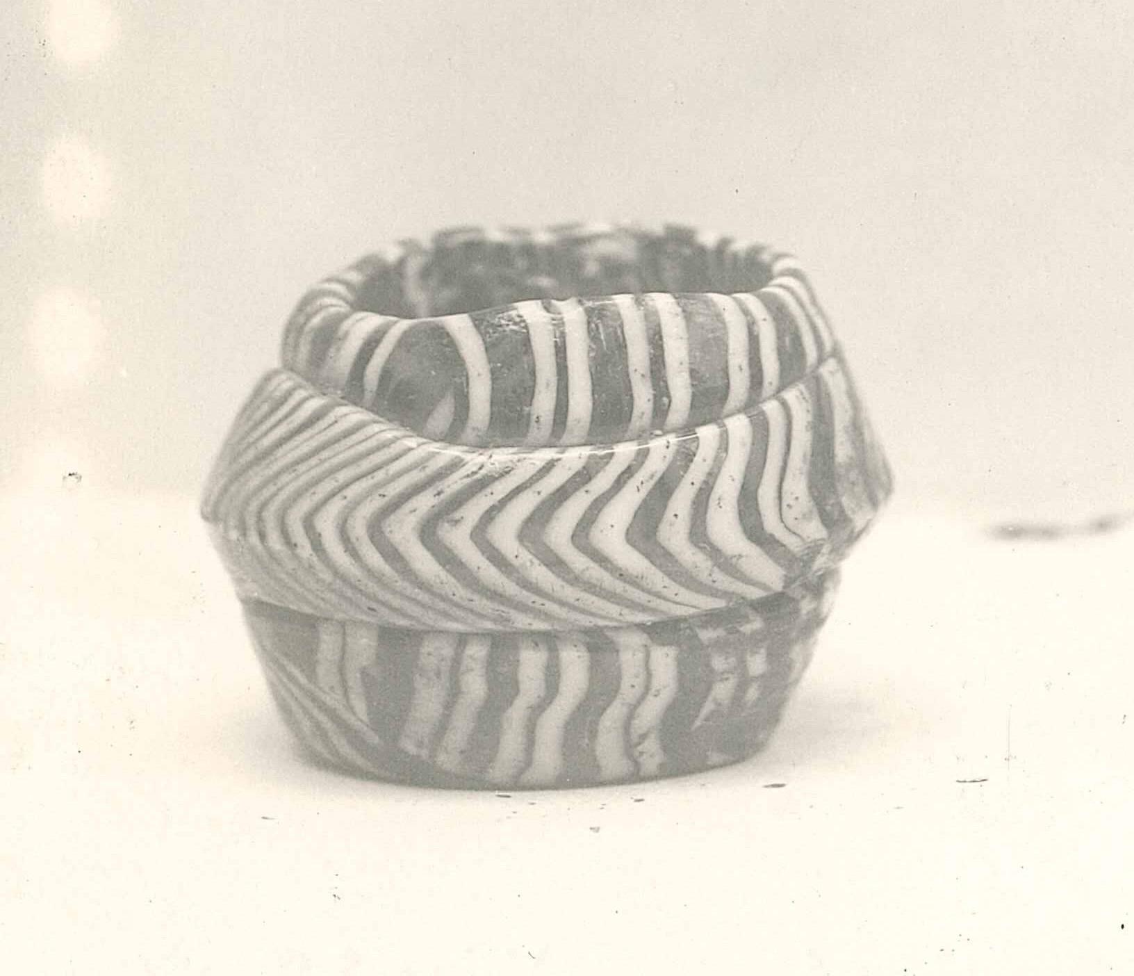 DescriptionDark blue ground; white decoration; ring shaped (spindle shaped profile); white threads applied diagonally and marvered; divided into three horizontal lobes (cane was probably wound around core three times).